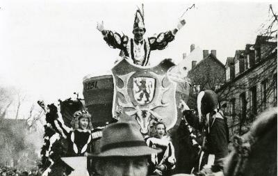 Prinz Franz II. (Gieraths) auf seinem Festwagen beim Karnevalszug 1954.